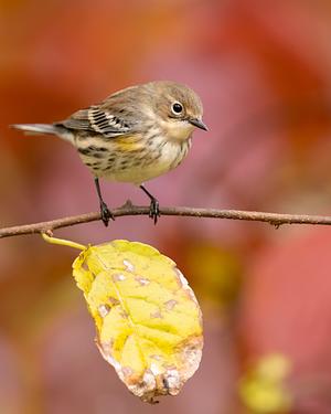 Yellow-rumped warbler in some red foliage